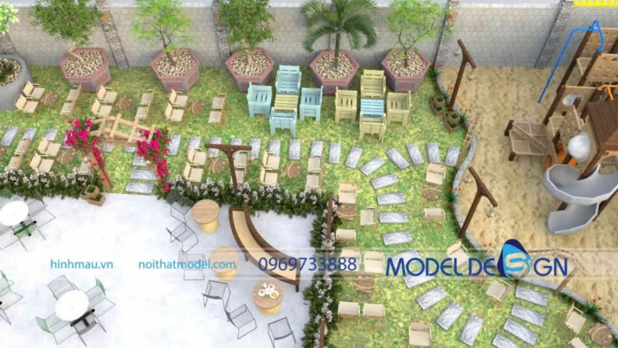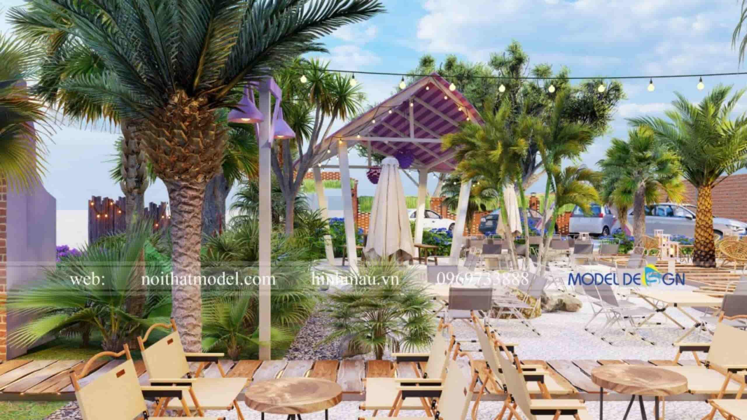 - Cân bằng giữa cây xanh và số lượng bàn ghế: Sân vườn cần đủ mảng xanh để tạo cảm giác thoáng mát nhưng không làm giảm quá nhiều chỗ ngồi. Bố trí theo cụm, vừa có góc riêng tư vừa đảm bảo doanh thu.